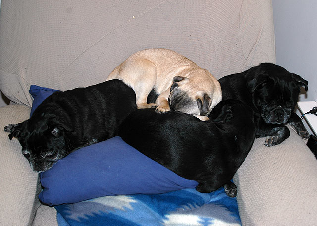 Back home we find four tuckered pugs taking over the recliner